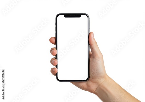 A hand holding a smartphone with a blank white screen against a plain white background in a studio shot