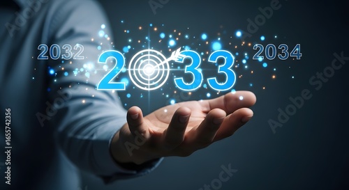 A hand holding a target with the year 2033 surrounded by the years 2032 and 2034 with sparkles
