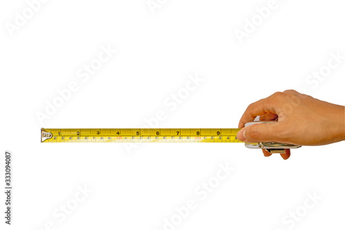 A hand holding a yellow color measurement tape, isolated die cut with clipping path on white background