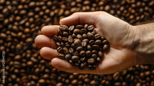 A hand holding freshly harvested coffee beans, with a background of roasted coffee beans scattered in a neat pattern