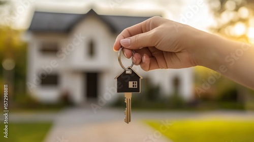 A hand holds a house-shaped keychain with a key, with a blurred suburban house in the background during daylight.