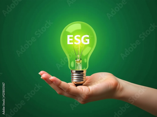 A Hand Holds A Light Bulb With An Esg Icon On A Green Background To Represent Sustainability And Ethics In Business Networking. 00003