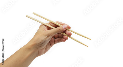 A hand holds a pair of wooden chopsticks isolated on white isolated on transparent background