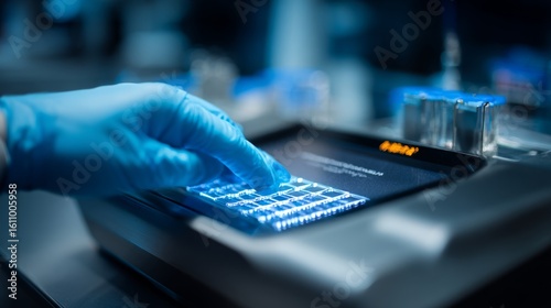 a hand in a glove is operating a digital interface with lit up buttons