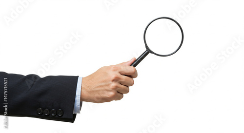 A hand in a suit holding a magnifying glass against a white background in a studio shot image style