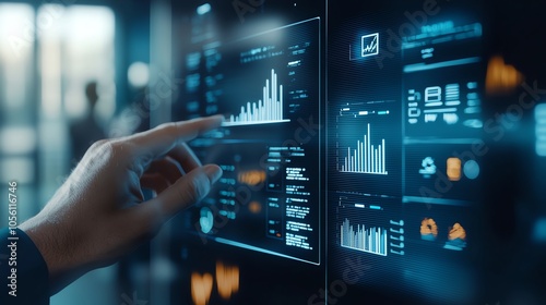 A hand interacting with a digital dashboard, showcasing graphs and data metrics for analysis in a futuristic environment.
