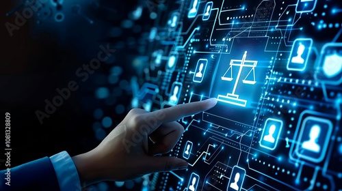 A hand interacting with a digital interface featuring scales of justice, symbolizing law and technology integration.