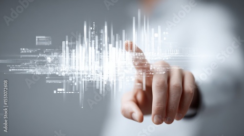 A hand interacting with a digital sound wave representation, symbolizing innovation.