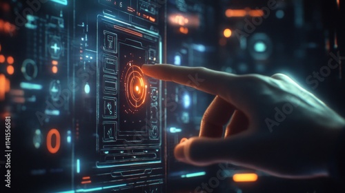A hand interacting with a futuristic digital interface featuring glowing elements.