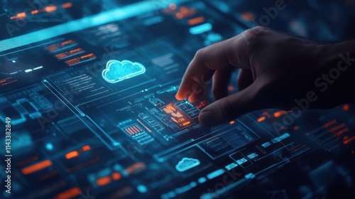 A hand interacting with a futuristic digital interface showcasing cloud technology.