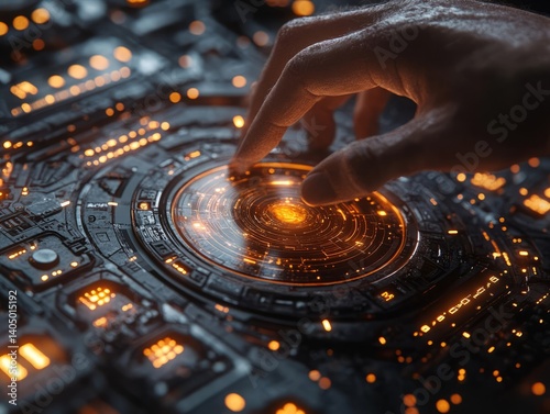 A hand interacting with a glowing futuristic touchscreen interface resembling a circuit board with digital patterns