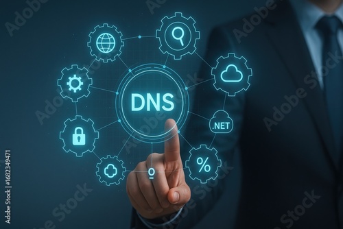 A hand interacts with a digital interface displaying a network diagram centered on the DNS system, illustrating various interconnected components and highlighting security elements.
