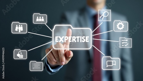 A hand interacts with a digital interface displaying expertise and related concepts.
