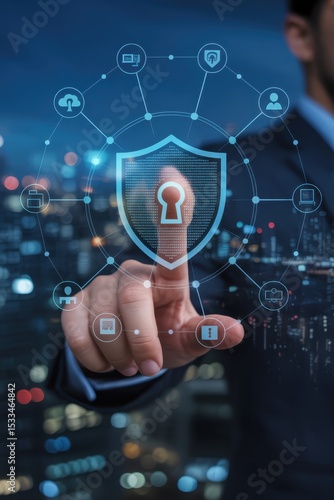 A hand interacts with a digital security interface overlaid on a city night scene.