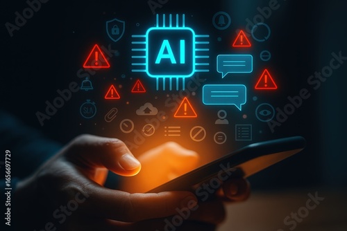 A hand interacts with a smartphone displaying holographic AI symbols, including warning signs and communication icons, casting a warm glow.