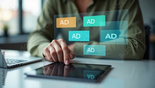 A hand interacts with a tablet, with holographic "AD" buttons floating above it.