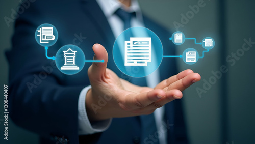 A Hand Interacts with Floating Legal Documents and Approval Workflows: Visualizing Legal Documentation and Compliance Processes in Stock Photography with Space for Text