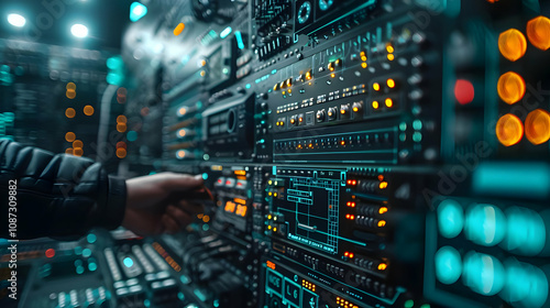 A Hand Interacts with Futuristic Digital Control Panel, Adjusting Complex System Settings in a Dark Room.