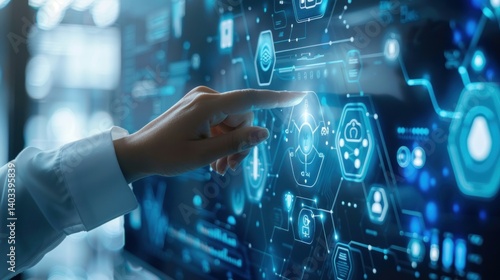 A hand is pointing at a computer screen with a blue background