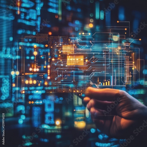A hand is pointing at a computer screen with a glowing, colorful image of a city