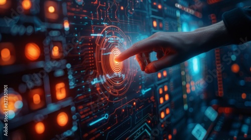 A hand is pointing at a glowing circle on a computer screen