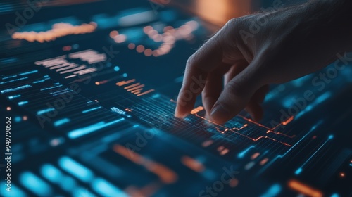 A hand is typing on a backlit laptop keyboard, with a focus on the fingers, imparting a technology-driven, cyber-themed aesthetic.