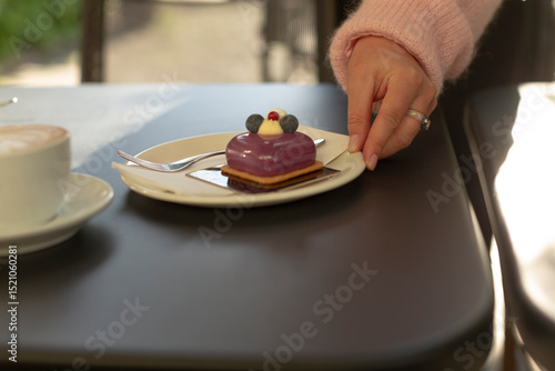 A hand placing a purple pastry topped with fruit on a plate next to a cup of coffee on a table in a caf setting