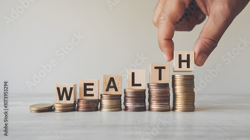 A hand placing wooden blocks to spell wealth among stacks of coins symbolizing financial growth in a minimalistic setting