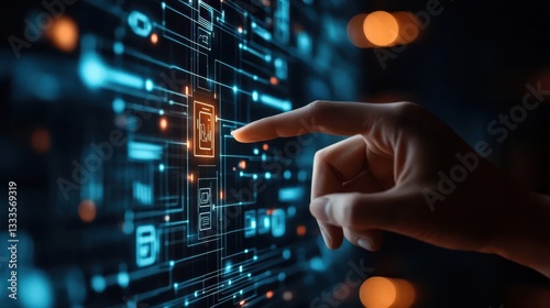 A hand pointing at a digital computer screen, illustrating the concept of technology and innovation.