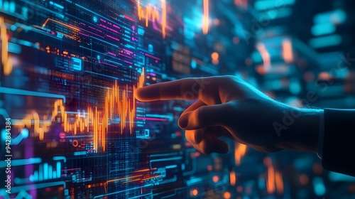 A hand pointing at a digital financial graph on a screen, illustrating market analysis, stock trading, and investment strategy.