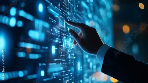 A hand pointing at a digital interface showing data and analytics in a futuristic setting.
