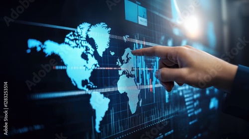 A hand pointing at a stock market chart with a world map in the background, highlighting an investment chart, finance chart