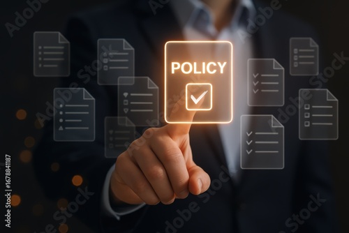A hand points to a glowing policy document icon, surrounded by other document icons, creating a modern business concept.