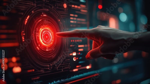 A hand points to a glowing red circle. Perfect for tech, science, and futuristic themes.