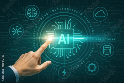 A hand points to an artificial intelligence symbol, surrounded by digital circuit and binary code elements, highlighting the technology concept.