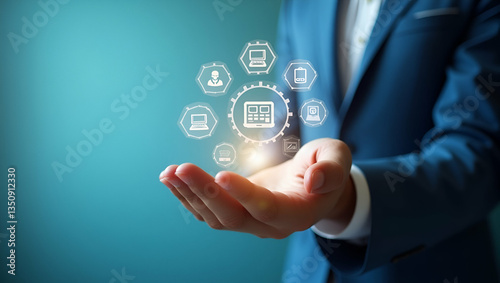 A Hand Presenting Holographic Icons: Highlighting the Importance of Digital Literacy in Modern Society - Stock Photo Concept with Empty Space for Customization
