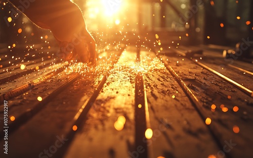 A hand reaches toward a sunlit wooden surface, surrounded by shimmering particles, capturing a moment of craftsmanship and warmth.