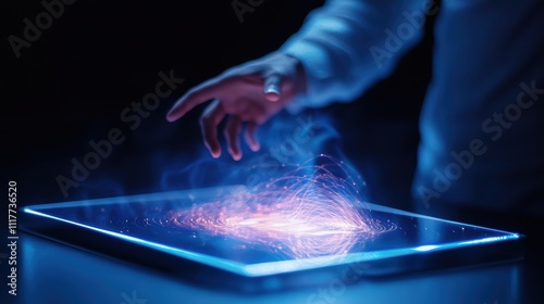 A hand reaches towards a glowing, swirling digital interface, creating an ethereal effect in a dark environment.