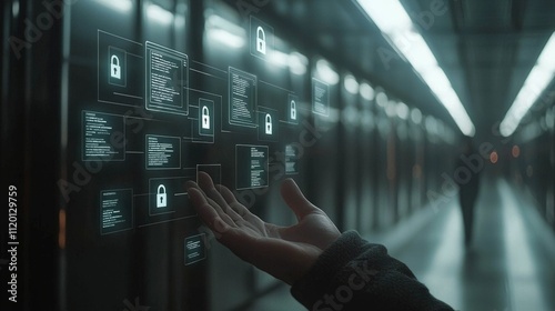 A hand reaches towards digital security icons in a futuristic hallway, showcasing advanced technology and data protection themes.