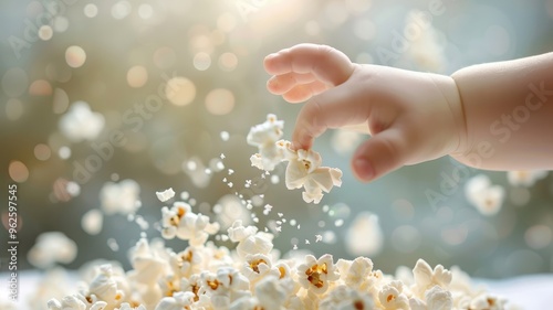 A hand reaching for a piece of popcorn, its kernels popping with anticipation.