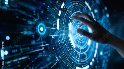 A hand reaching towards a futuristic digital interface, suggesting the interaction with advanced technology, innovation, and the modern digital age we live in today.