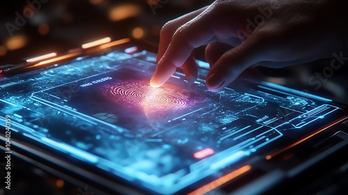 A hand scanning a fingerprint on a futuristic payment device, holographic interface showing payment success, neon accents and glowing blue lights, sleek technology design, dimly lit background,