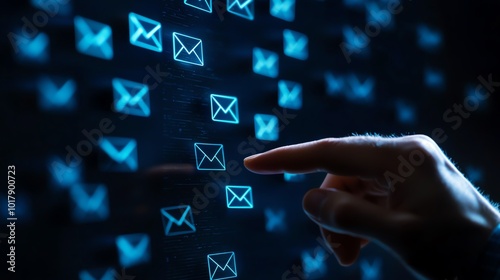 A hand touching a digital screen with glowing envelope icons, symbolizing communication and email interactions.