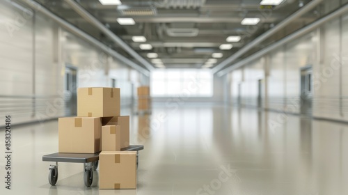 A hand truck with cardboard boxes in a clean, industrial setting, with empty space on the floor or walls for adding text or logos
