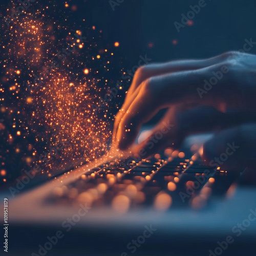 A hand typing on a keyboard with glowing particles, symbolizing creativity.