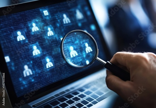 A hand uses a magnifying glass to examine digital profiles displayed on a laptop screen, highlighting online data analysis and personnel research. : Generative AI