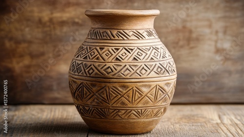 A handcrafted clay vase with tribal patterns, set against a warm golden brown background