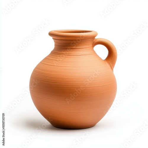 A handcrafted terracotta pot with a smooth finish and a curved shape, isolated on a white background.