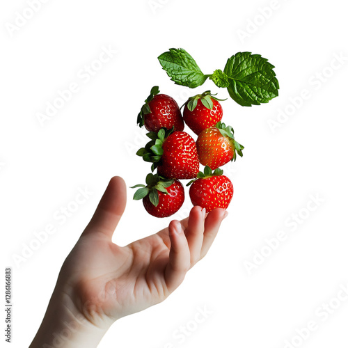 A Handful of Fresh Strawberries with Mint Leaf Isolated on Transparent Background