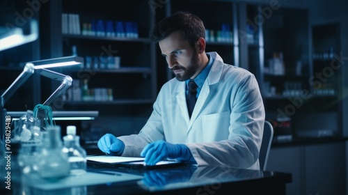 A handsome serious scientist man wearing a medical gown and gloves uses a tablet for analysis in a modern research laboratory. Biotechnology, Modern technology concepts.